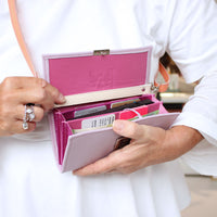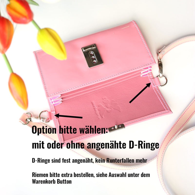 Du kannst jede Elli Geldbörse zu einer Umhängetasche machen. Leg einfach einen Strap in derselben Größe wie deine Elli unter den Deckel ein und schließe die Geldbörse. Hänge dann einen langen Riemen an den beiden D-Ringen ein. So vergißt du nie wieder deinen Geldbeutel im Supermarktregal 😉