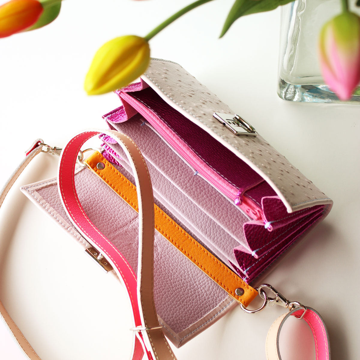 Du kannst jede Elli Geldbörse zu einer Umhängetasche machen. Leg einfach einen Strap in derselben Größe wie deine Elli unter den Deckel ein und schließe die Geldbörse. Hänge dann einen langen Riemen an den beiden D-Ringen ein. So vergißt du nie wieder deinen Geldbeutel im Supermarktregal 😉
