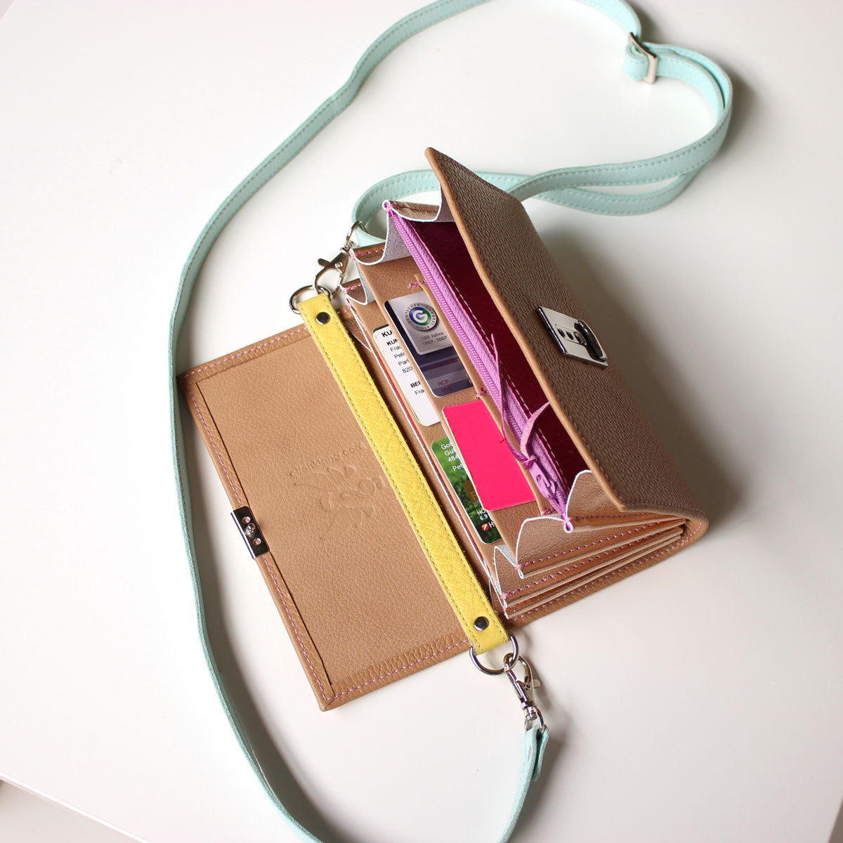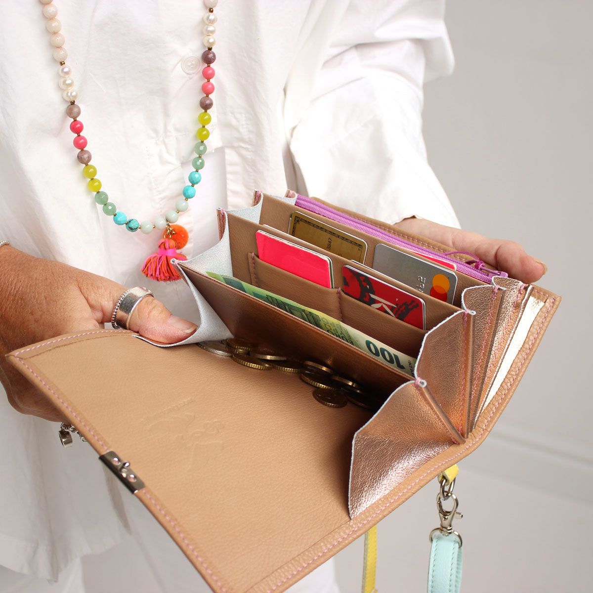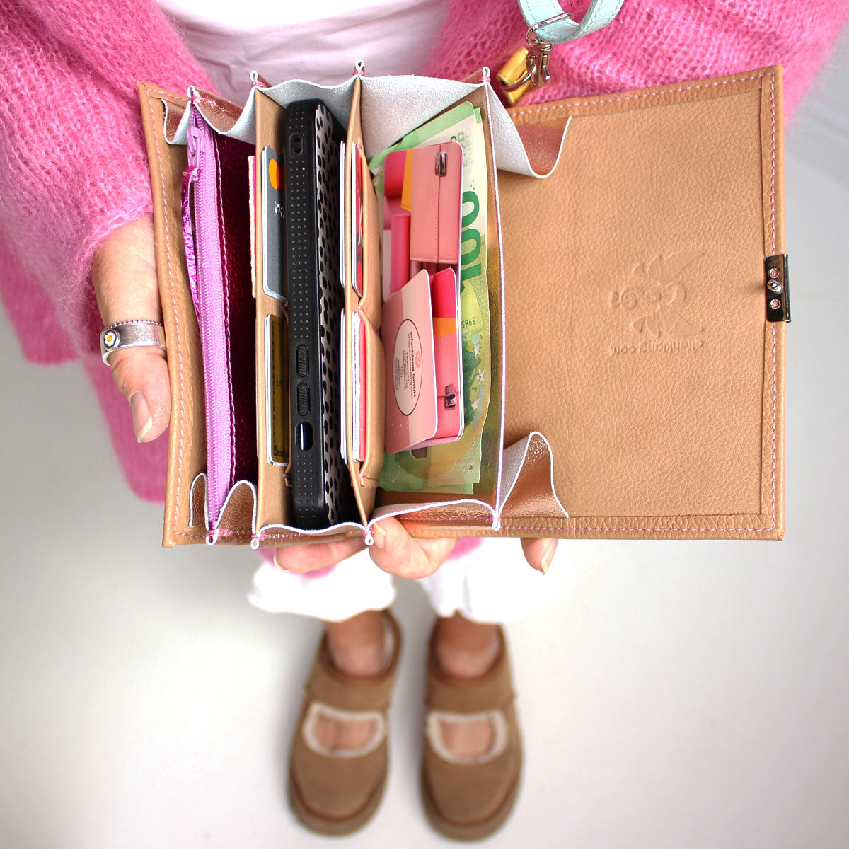 Du kannst jede Elli Geldbörse zu einer Umhängetasche machen. Leg einfach einen Strap in derselben Größe wie deine Elli unter den Deckel ein und schließe die Geldbörse. Hänge dann einen langen Riemen an den beiden D-Ringen ein. So vergißt du nie wieder deinen Geldbeutel im Supermarktregal 😉