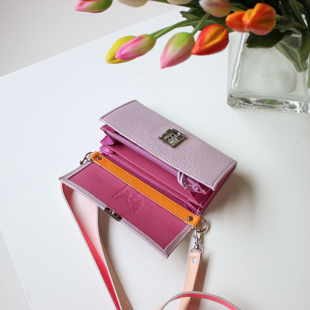Du kannst jede Elli Geldbörse zu einer Umhängetasche machen. Leg einfach einen Strap in derselben Größe wie deine Elli unter den Deckel ein und schließe die Geldbörse. Hänge dann einen langen Riemen an den beiden D-Ringen ein. So vergißt du nie wieder deinen Geldbeutel im Supermarktregal 😉