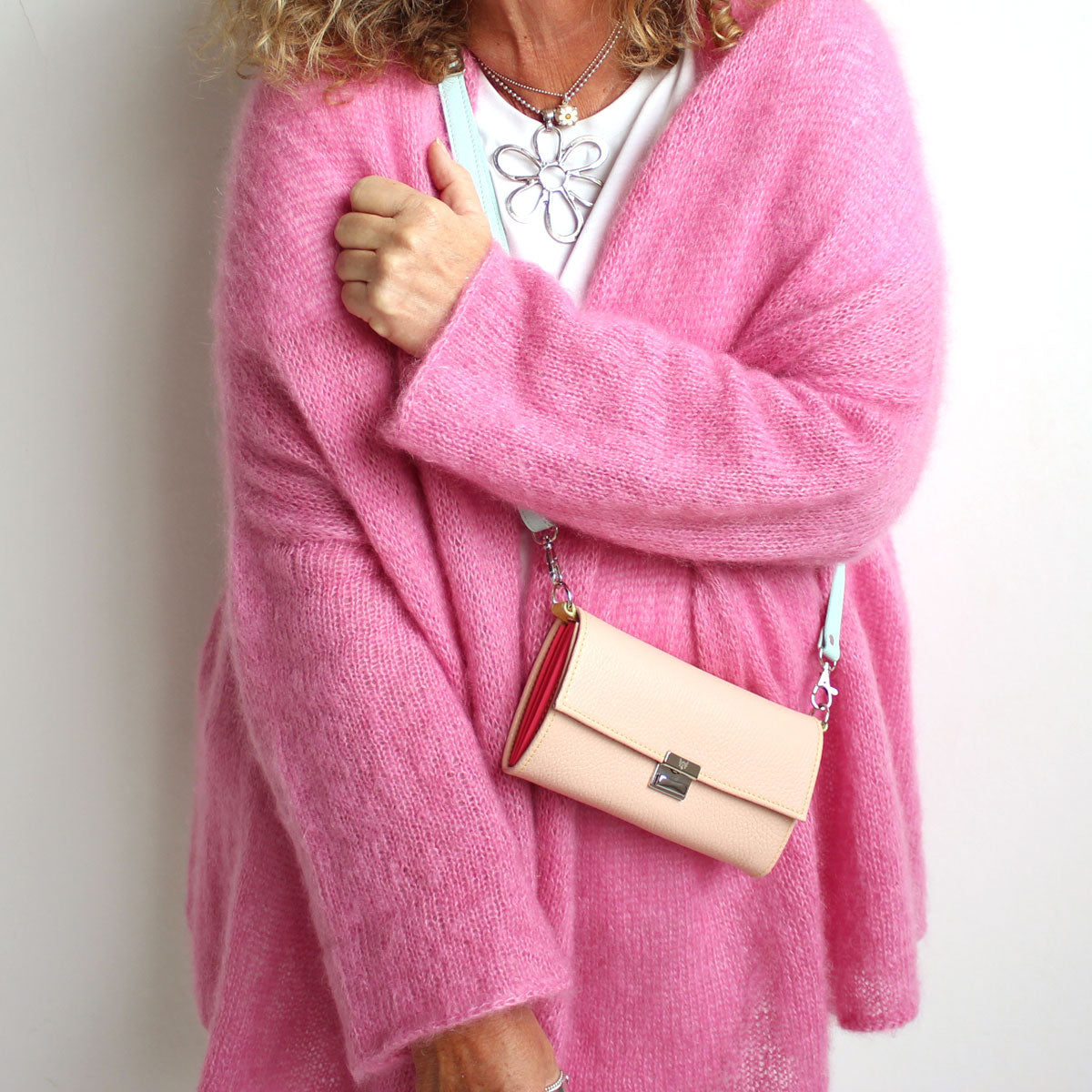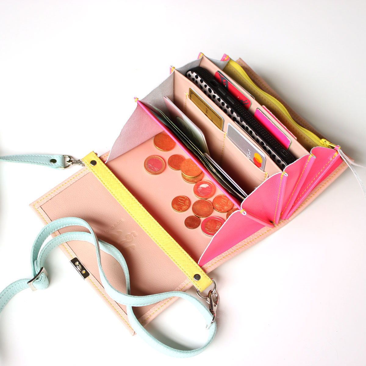 Du kannst jede Elli Geldbörse zu einer Umhängetasche machen. Leg einfach einen Strap in derselben Größe wie deine Elli unter den Deckel ein und schließe die Geldbörse. Hänge dann einen langen Riemen an den beiden D-Ringen ein. So vergißt du nie wieder deinen Geldbeutel im Supermarktregal 😉