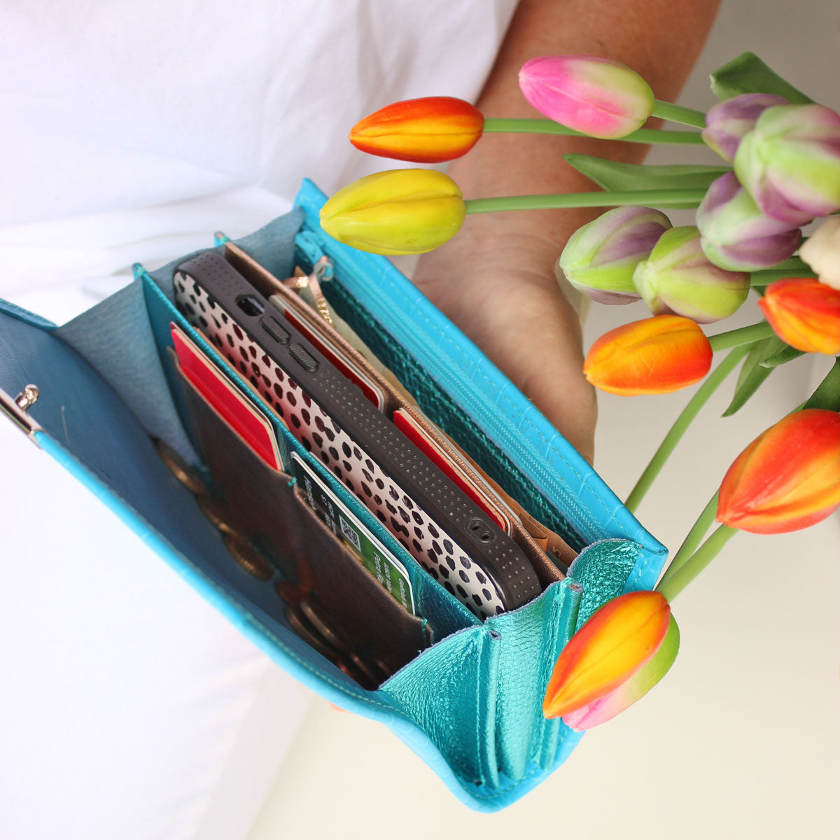 Du kannst jede Lou Geldbörse zu einer Umhängetasche machen. Leg einfach einen Strap in derselben Größe wie deine Lou unter den Deckel ein und schließe die Geldbörse. Hänge dann einen langen Riemen an den beiden D-Ringen ein. So vergißt du nie wieder deinen Geldbeutel im Supermarktregal 😉
