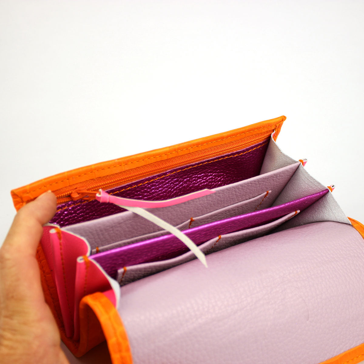 Außenleder: Knallorange mit plastischer Krokoprägung