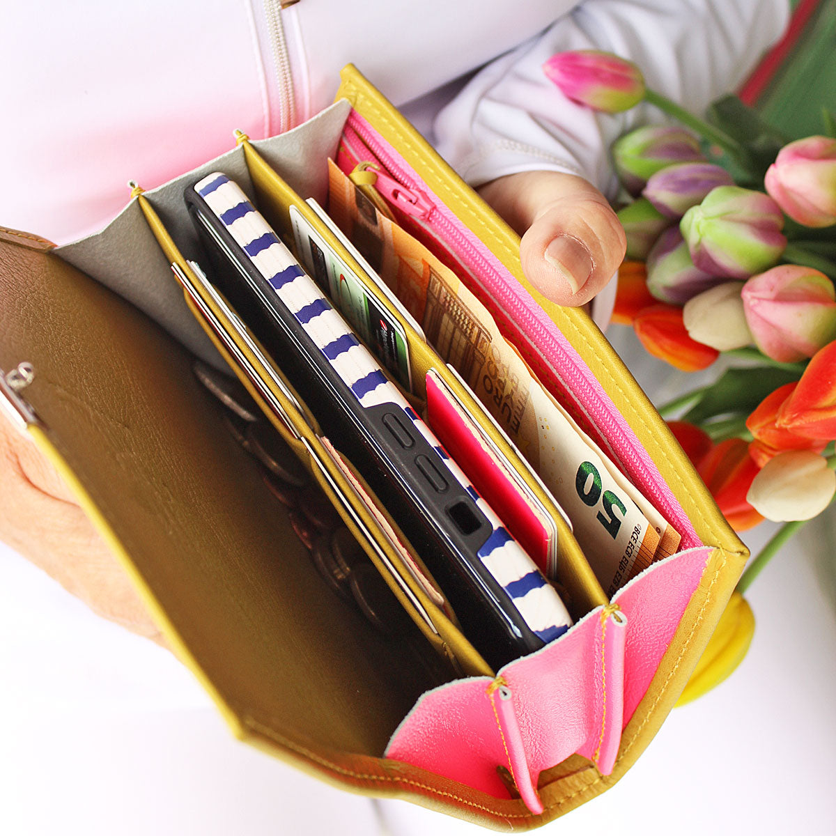 Du wirst überrascht sein, wie viel Platz es für all deine Karten gibt und wie wunderbar es ist, in das große Münzfach einfach hineinzugreifen. Mit 2 Trennstegen hat sie 3 geräumige Fächer für Geldscheine, Karten, Handy oder Sonstiges. Ein Reißverschlussfach hält z.B. Schmuck oder Tabletten griffbereit verschlossen.