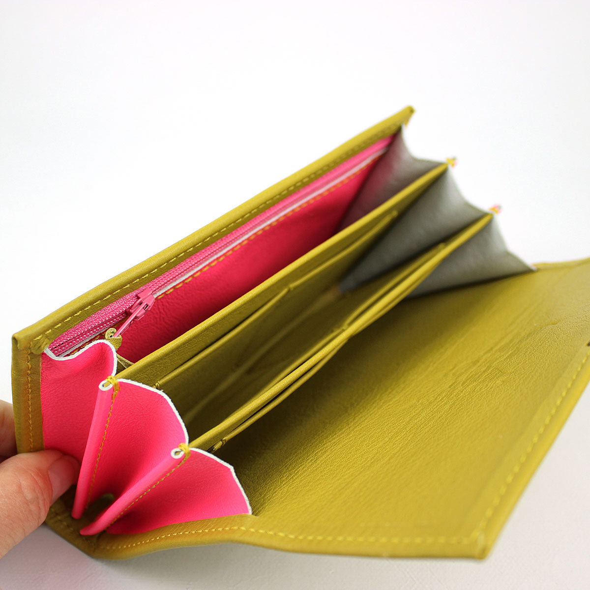 Außenleder: Leder Curry (abgetöntes Senfgelbgrün), feinporig, matt, unempfindlich