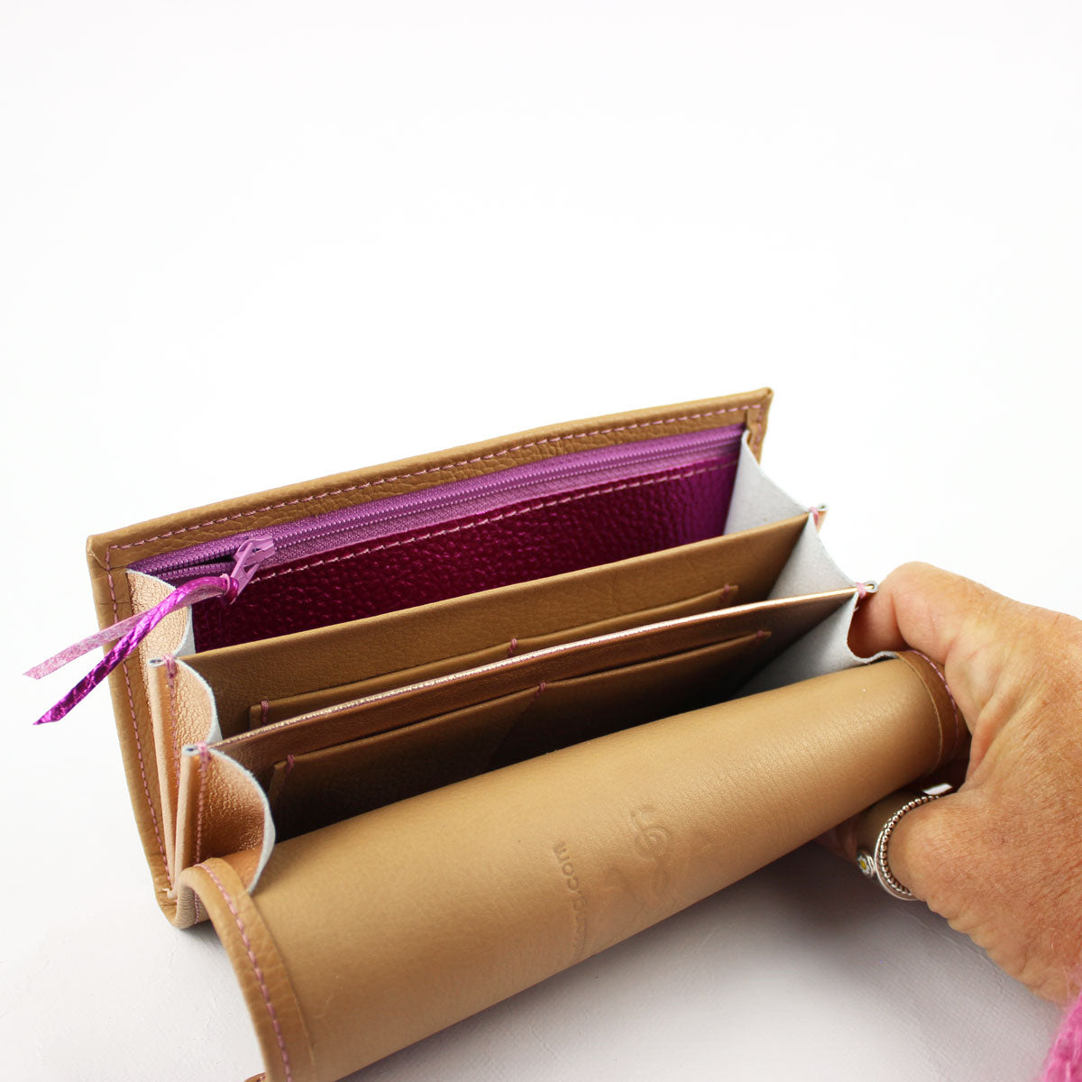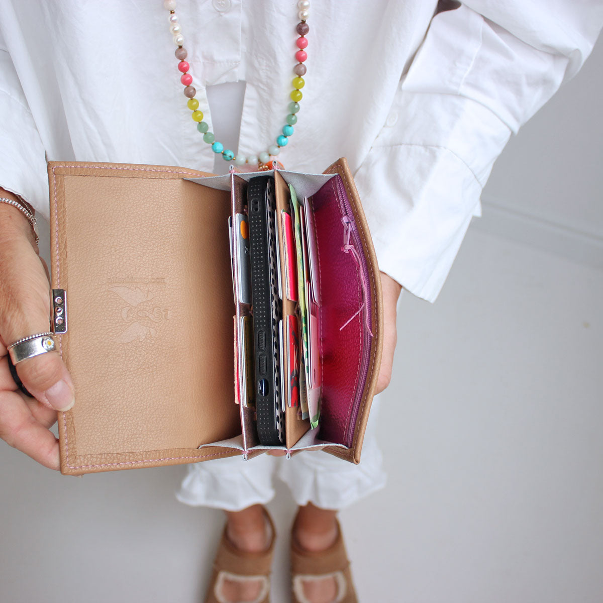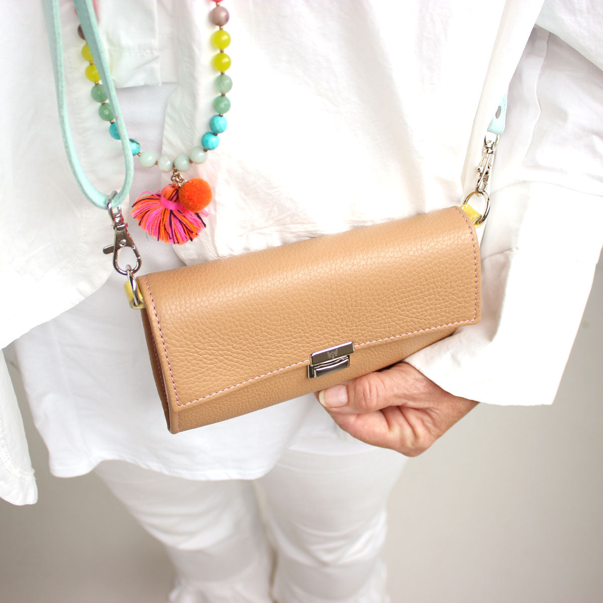 Du kannst jede Lou Geldbörse zu einer Umhängetasche machen. Leg einfach einen Strap in derselben Größe wie deine Lou unter den Deckel ein und schließe die Geldbörse. Hänge dann einen langen Riemen an den beiden D-Ringen ein. So vergißt du nie wieder deinen Geldbeutel im Supermarktregal 😉