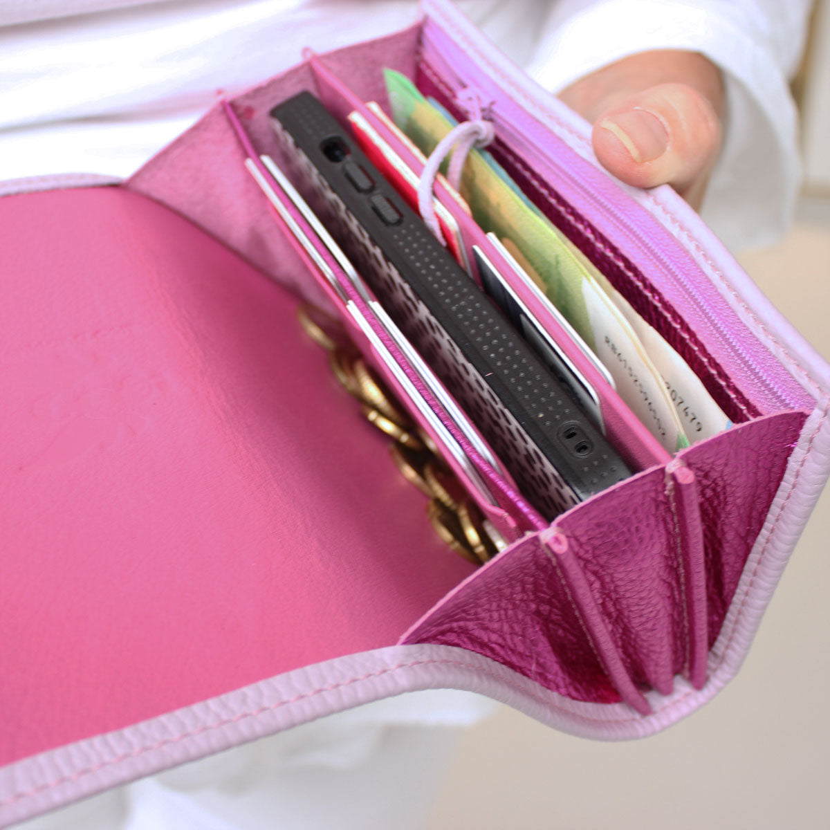 Du kannst jede Lou Geldbörse zu einer Umhängetasche machen. Leg einfach einen Strap in derselben Größe wie deine Lou unter den Deckel ein und schließe die Geldbörse. Hänge dann einen langen Riemen an den beiden D-Ringen ein. So vergißt du nie wieder deinen Geldbeutel im Supermarktregal 😉