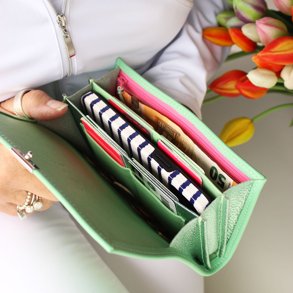 Du wirst überrascht sein, wie viel Platz es für all deine Karten gibt und wie wunderbar es ist, in das große Münzfach einfach hineinzugreifen. Mit 2 Trennstegen hat sie 3 geräumige Fächer für Geldscheine, Karten, Handy oder Sonstiges. Ein Reißverschlussfach hält z.B. Schmuck oder Tabletten griffbereit verschlossen.