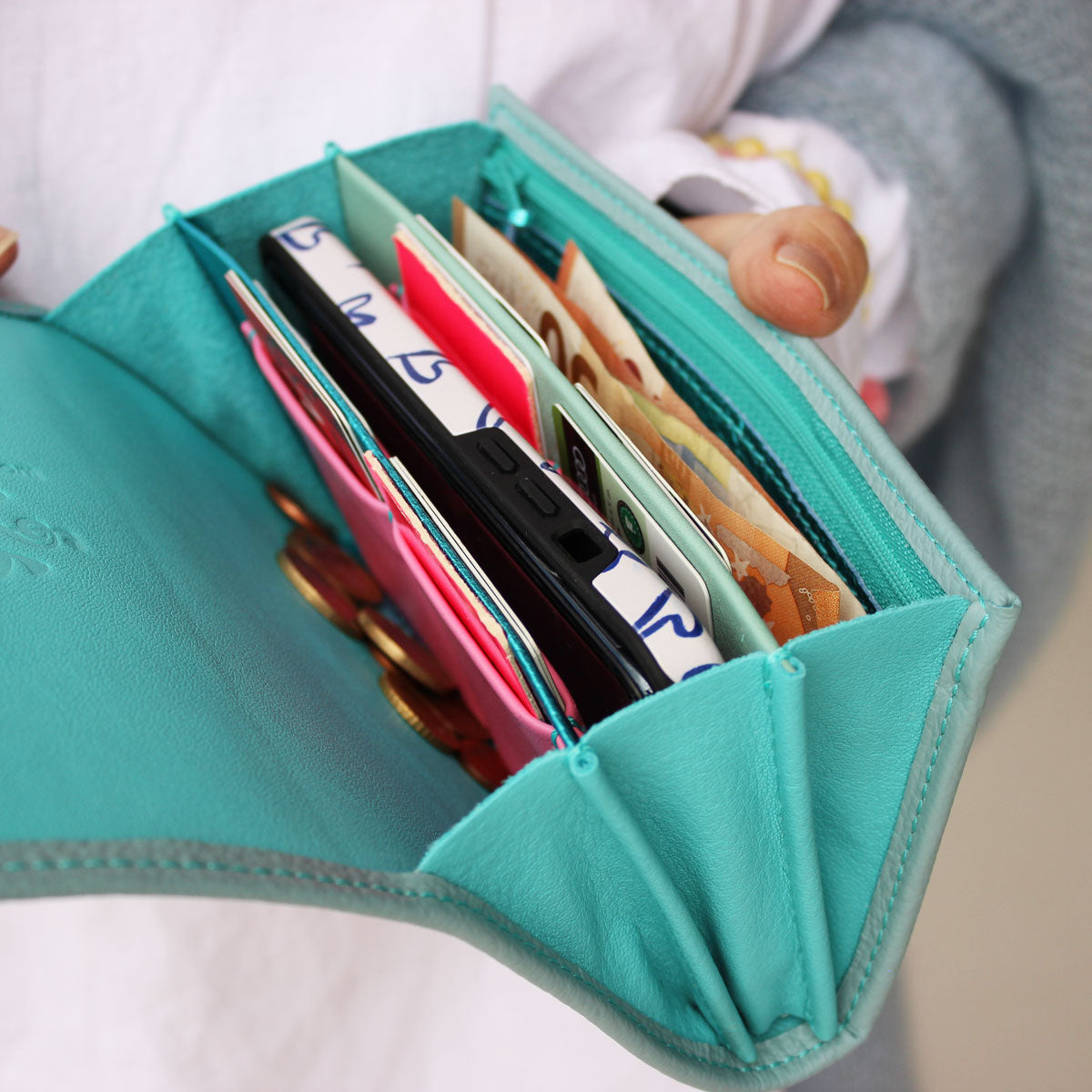 Du wirst überrascht sein, wie viel Platz es für all deine Karten gibt und wie wunderbar es ist, in das große Münzfach einfach hineinzugreifen. Mit 2 Trennstegen hat sie 3 geräumige Fächer für Geldscheine, Karten, Handy oder Sonstiges. Ein Reißverschlussfach hält z.B. Schmuck oder Tabletten griffbereit verschlossen.