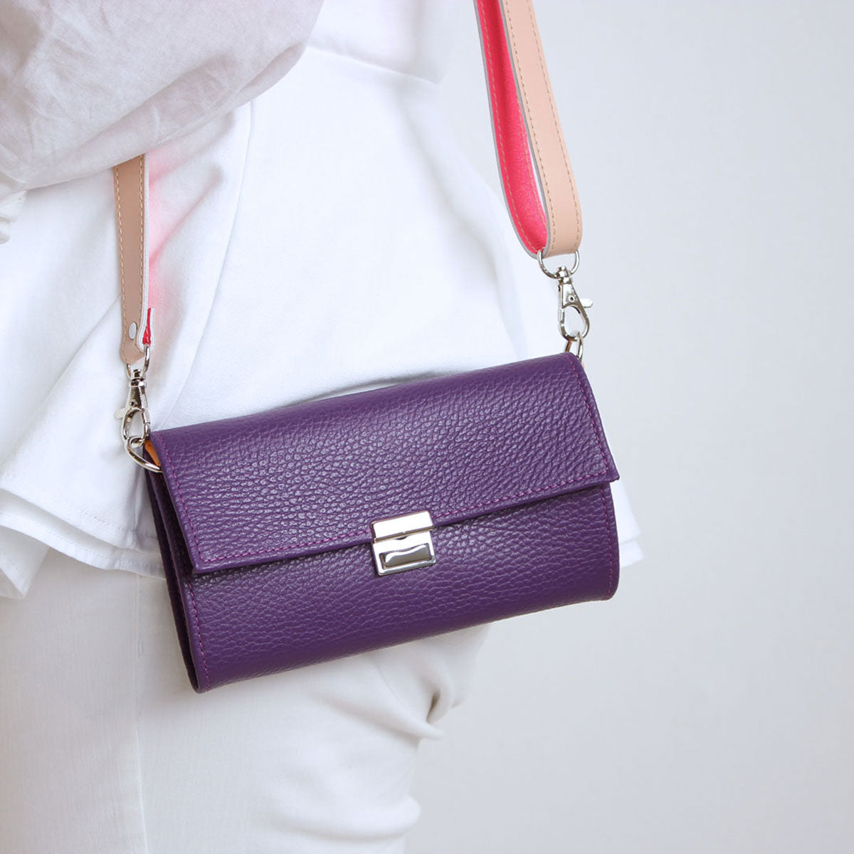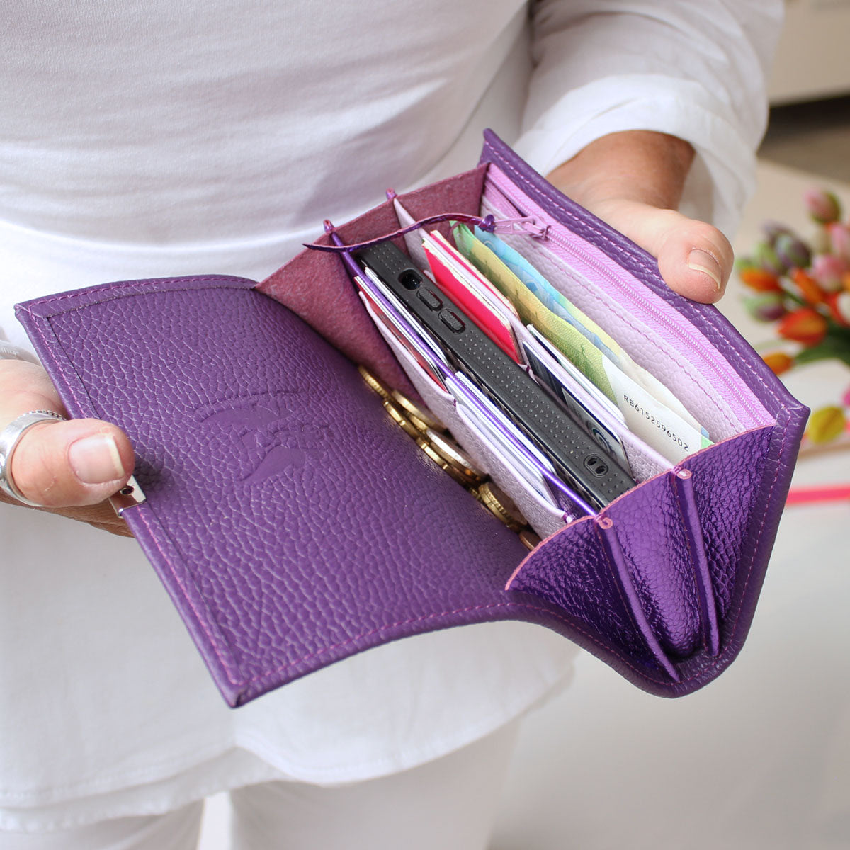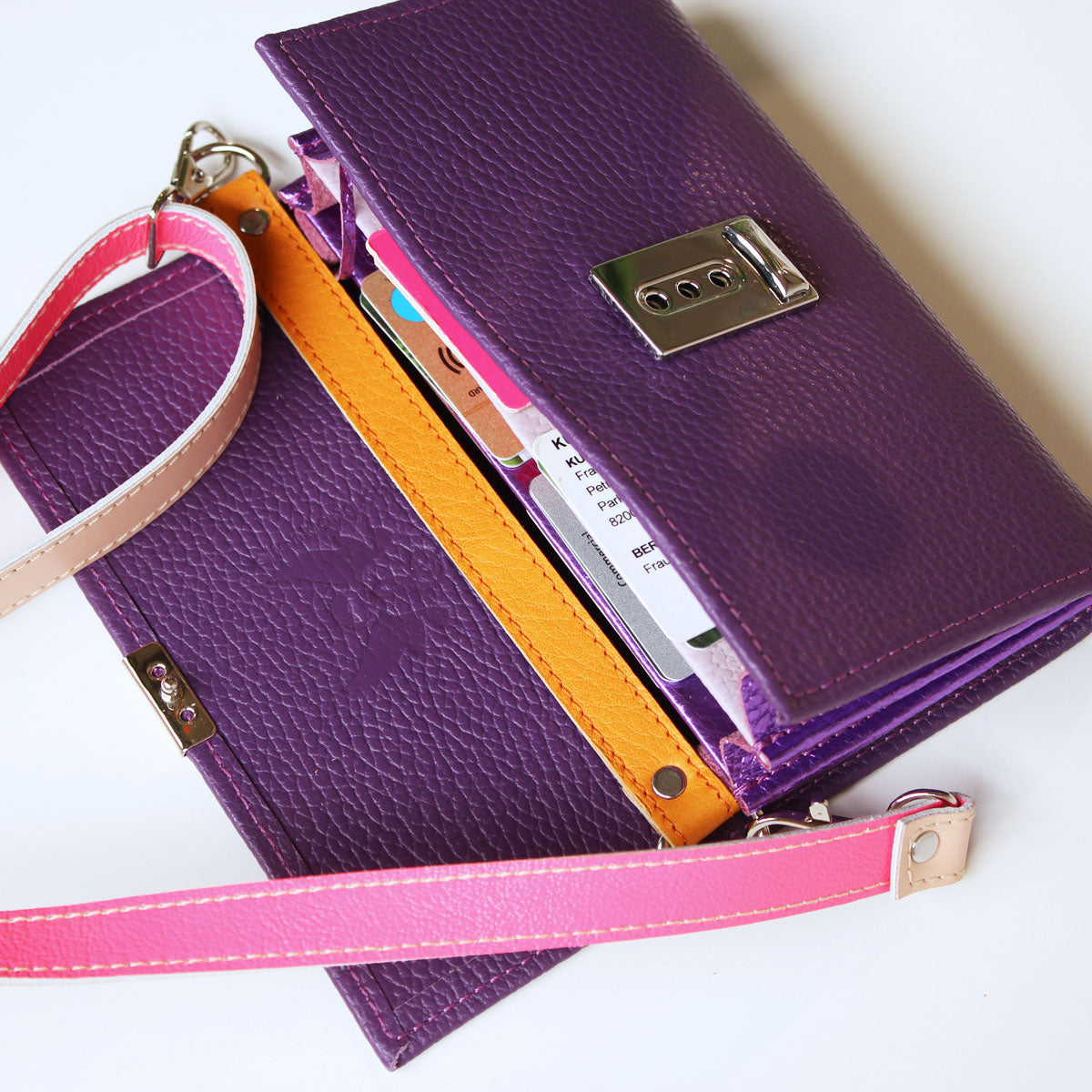 Du kannst jede Lou Geldbörse zu einer Umhängetasche machen. Leg einfach einen Strap in derselben Größe wie deine Lou unter den Deckel ein und schließe die Geldbörse. Hänge dann einen langen Riemen an den beiden D-Ringen ein. So vergißt du nie wieder deinen Geldbeutel im Supermarktregal 😉