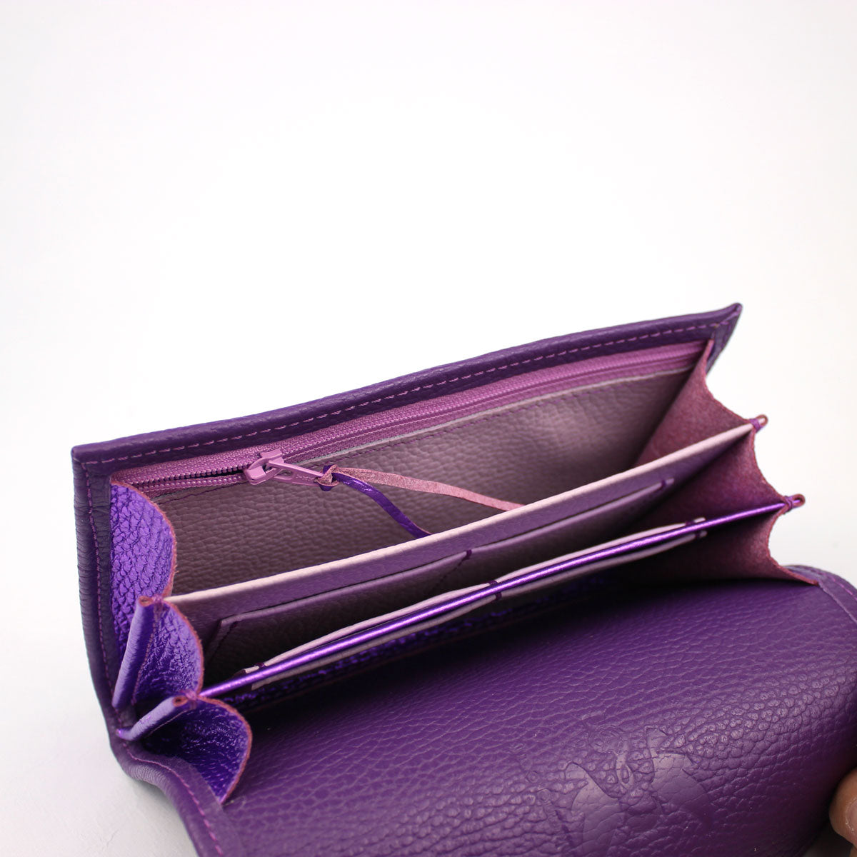 Unsere Lou kommt mit 3 großzügigen Fächern und etwas schaler als unsere Elli. Sie riecht nach echtem Leder, weil auch nur echtes Leder verarbeitet wird- im Inneren und Außen. Das spürst du auch sofort. Kein billiger Futterstoff stört diese Ästhetik.