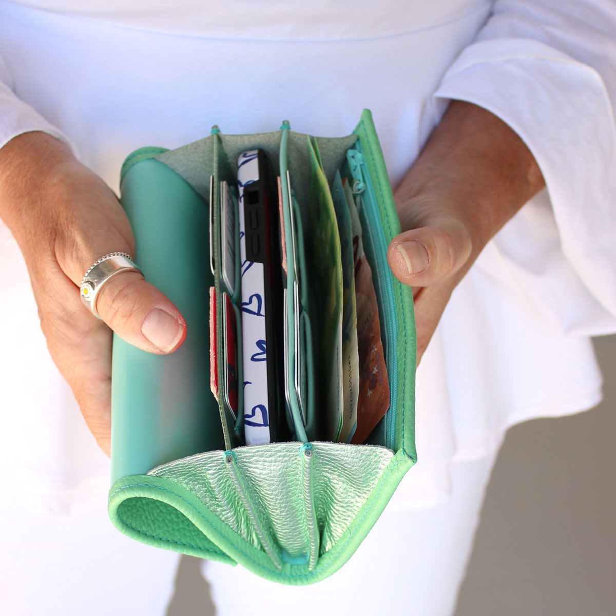 Du wirst überrascht sein, wie viel Platz es für all deine Karten gibt und wie wunderbar es ist, in das große Münzfach einfach hineinzugreifen. Mit 2 Trennstegen hat sie 3 geräumige Fächer für Geldscheine, Karten, Handy oder Sonstiges. Ein Reißverschlussfach hält z.B. Schmuck oder Tabletten griffbereit verschlossen.