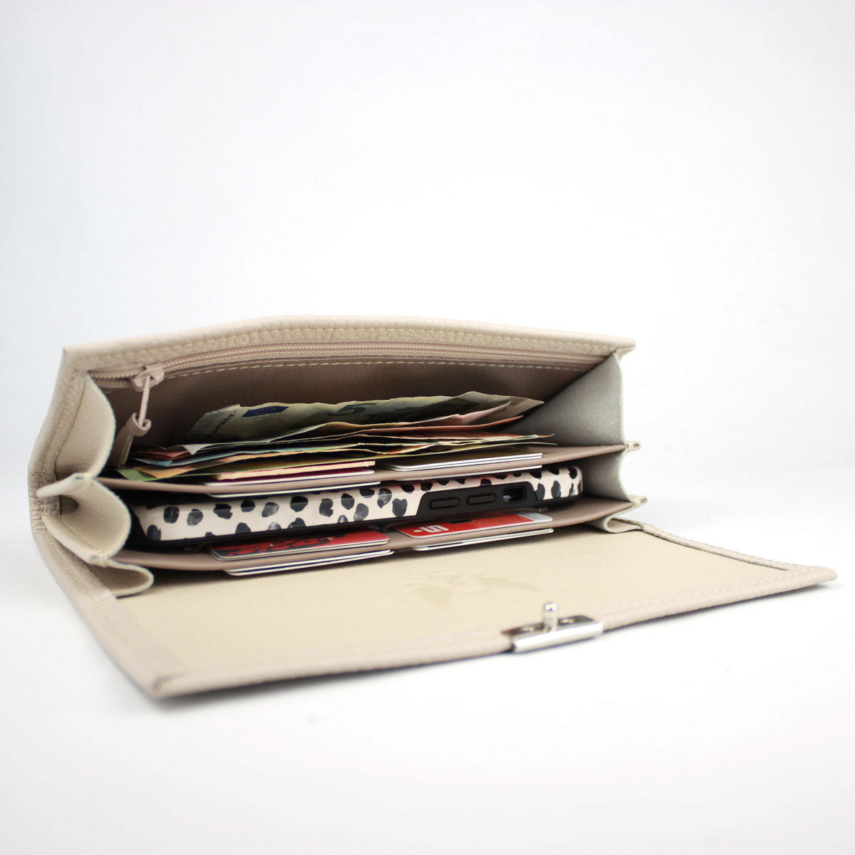 Du wirst überrascht sein, wie viel Platz es für all deine Karten gibt und wie wunderbar es ist, in das große Münzfach einfach hineinzugreifen. Mit 2 Trennstegen hat sie 3 geräumige Fächer für Geldscheine, Karten, Handy oder Sonstiges. Ein Reißverschlussfach hält z.B. Schmuck oder Tabletten griffbereit verschlossen.