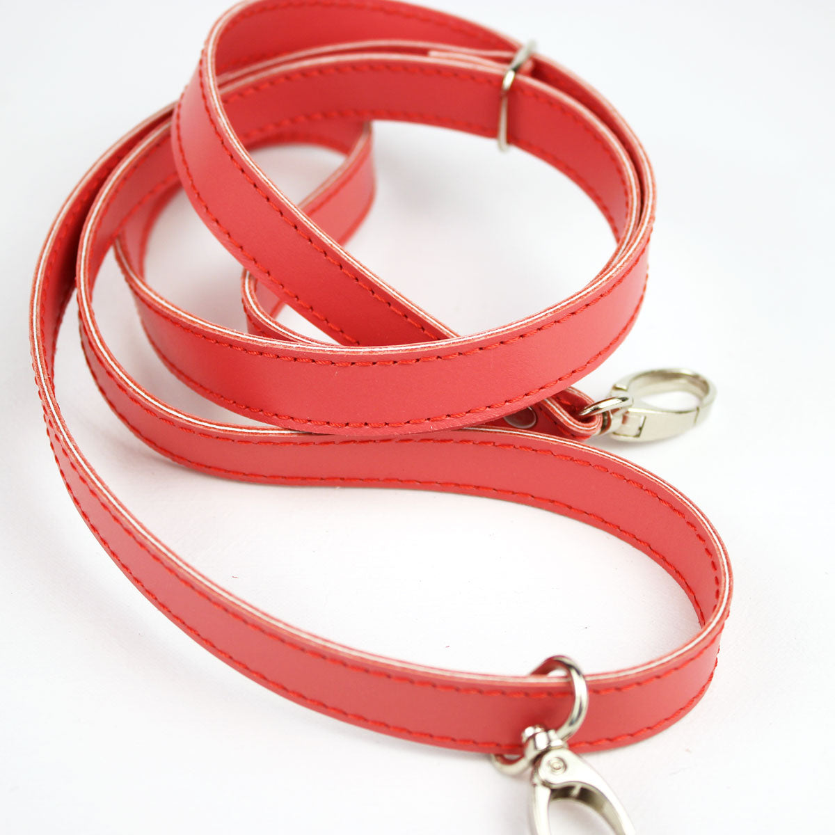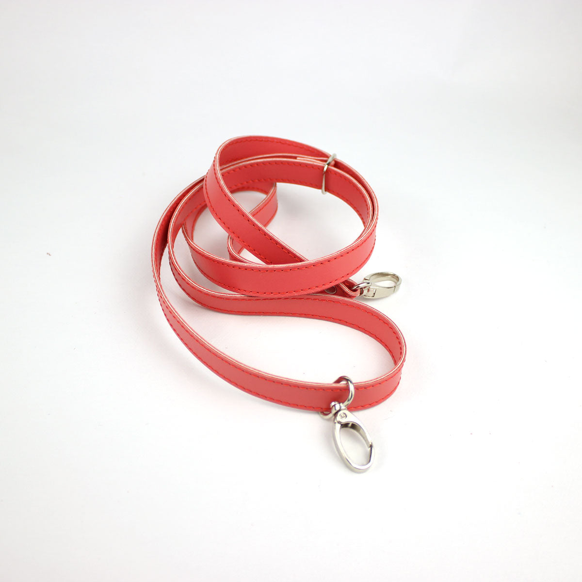 Leder Dunkle Koralle mit Nähten in Korallenrot auf einer Länge von 70 bis ca. 130 cm verstellbar. Breite 15/ 16 mm. 2 Karabiner aus Nickel zum Anhängen.